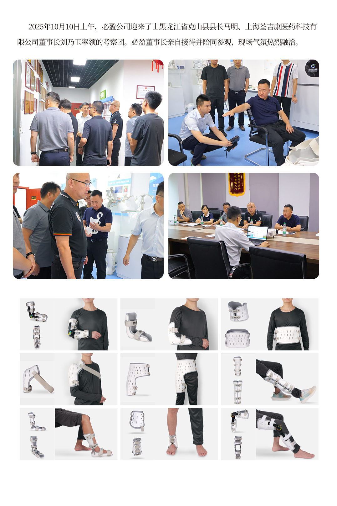2025年10月10日上午,必盈公司迎来了由黑龙江省克山县县长马明、上海荃吉康医药科技有限公司董事长刘乃玉率领的考察团。必盈董事长亲自接待并陪同参观,现场气氛热烈融洽。